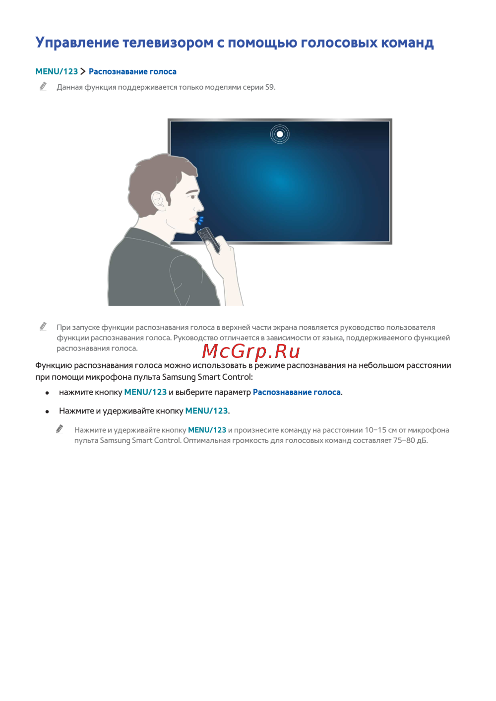 пульта Samsung Smart Control. Оптимальная громкость для голосовых команд составляет 75–80 дБ.