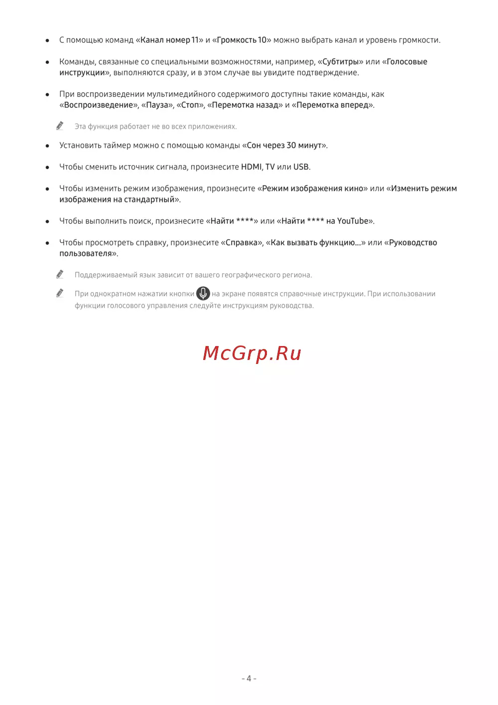 Узнайте, как использовать голосовые команды для управления каналами, громкостью и мультимедийным содержимым. Получите доступ к специальным функциям и справке.
