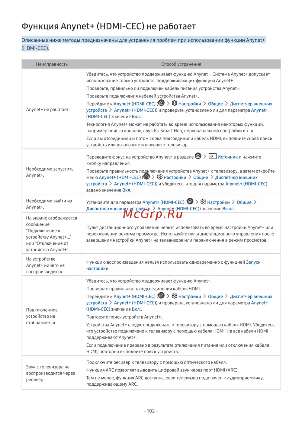 Узнайте, как устранить неполадки с функцией Anynet+ (HDMI-CEC). Проверьте подключения, настройки и совместимость устройств для корректной работы.