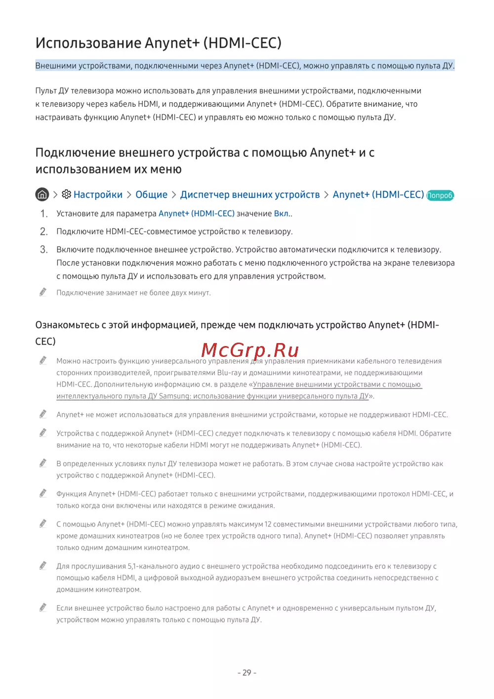 кроме домашних кинотеатров (но не более трех устройств одного типа). Anynet+ (HDMI-CEC) позволяет управлять