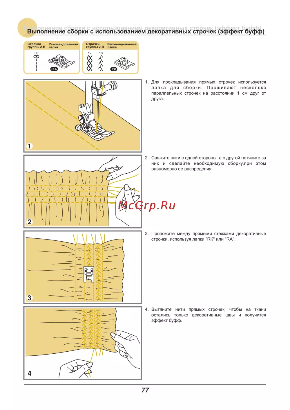Выполнение сборки с использованием декоративных строчек эффект буфф 1 Для прокладывания прямых строчек исполь лапка для сборки Прошивают нес параллельных строчек на расстоянии 1 см д друга 2 Свяжите нити с одной стороны а с другой потян них и сделайте необходимую сборку при равномерно ее распределяя 3 Проложите между прямыми стежками декора строчки используя лапки ИК или КА 4 77 Вытяните нити прямых строчек чтобы остались только декоративные швы и эффект буфф на пол