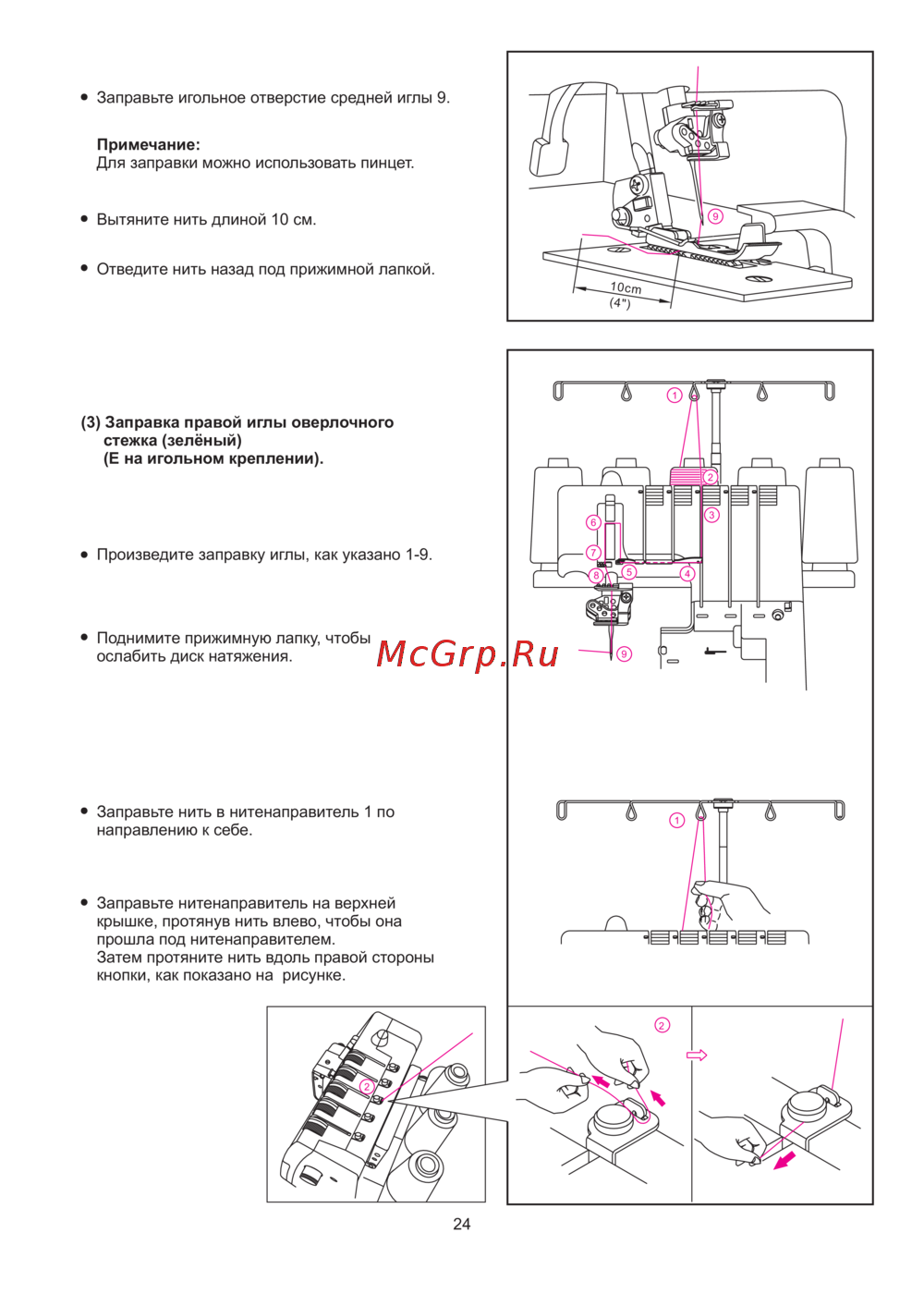 - Заправьте нитенаправитель расположенный на верхней крышке протянув нить влево затем вправо вдоль правой стороны кнопки как показано на рисунке p.24