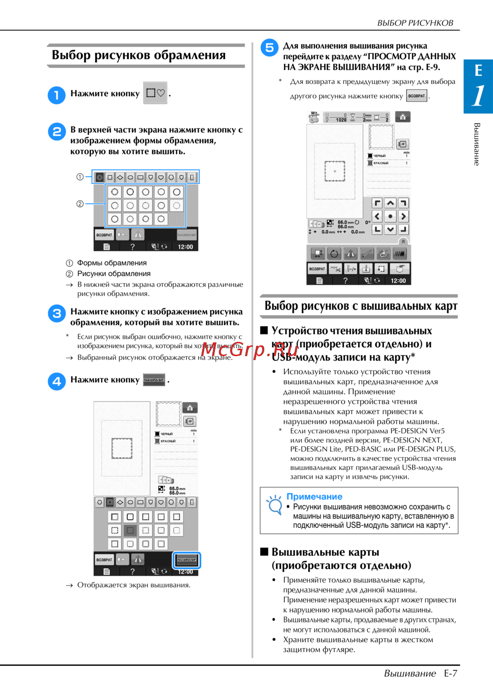 НА ЭКРАНЕ ВЫШИВАНИЯ” на стр. E-9.