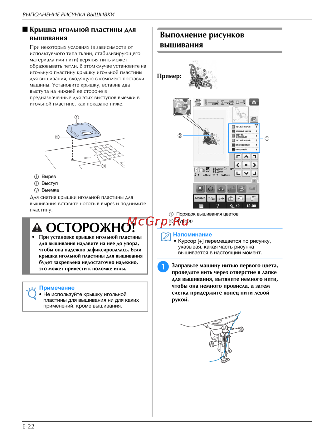 - Установите шпульку на которой намотана нить длина которой достаточна для вышивания выбранного рисунка p.158