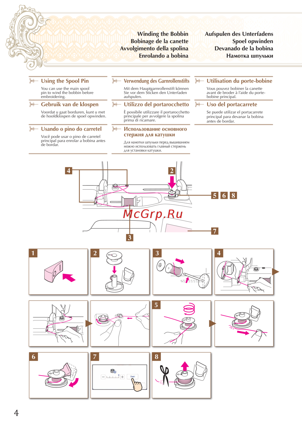 - Winding the bobbin aufspulen des unterfadens bobinage de la canette spoel opwinden avvolgimento della spolina devanado de la bobina enrolando a bobina намотка шпульки p.4