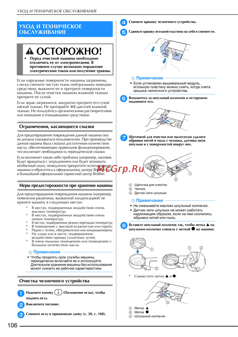 - Очистка челночного устройства p.108