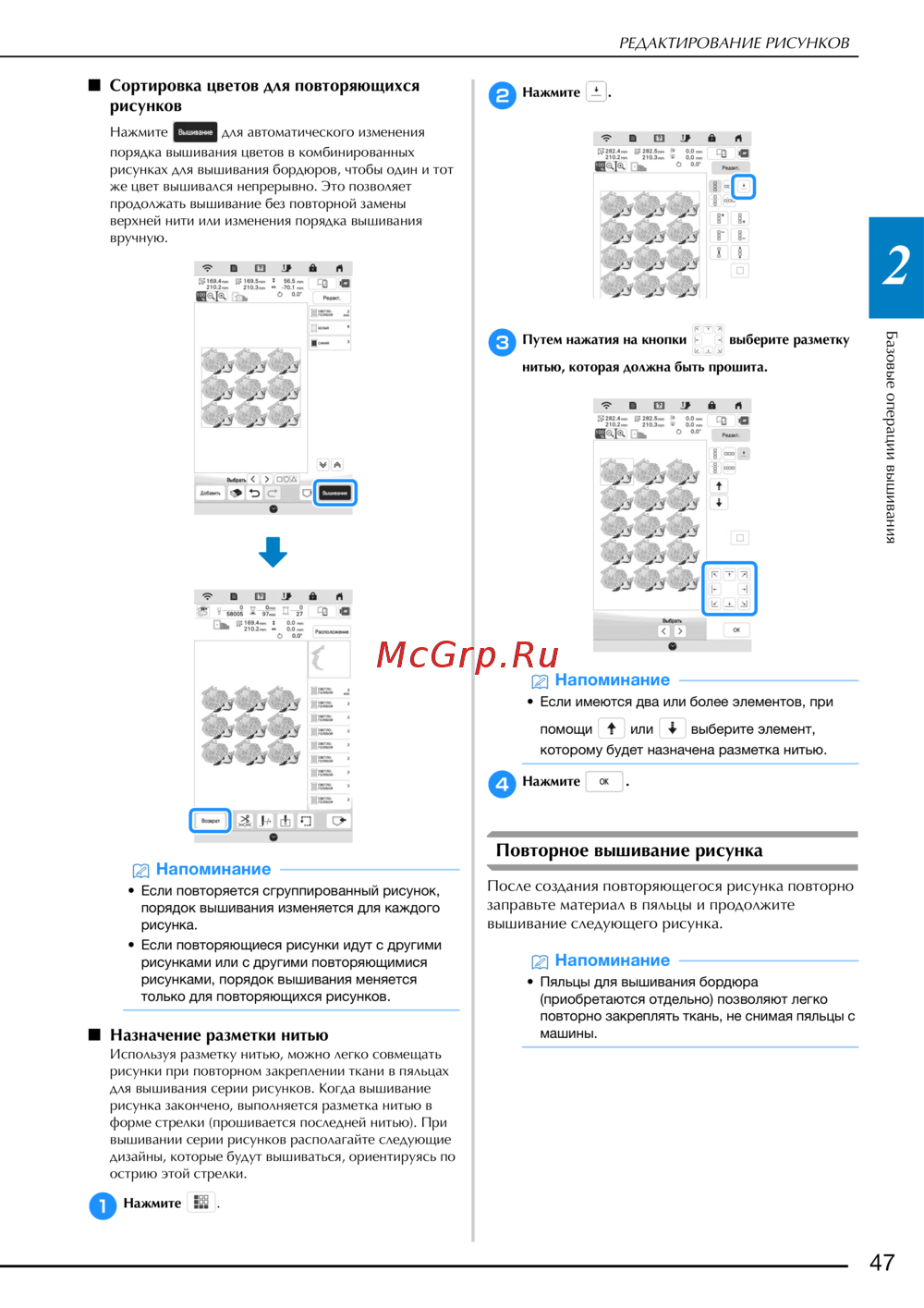 - При использовании данных для вышивании отличных от оригинальных рисунков при вышивании слишком плотных стежков или трех и более перекрывающихся стежков может произойти обрыв нити или может быть повреждена игла в этом случае с помощью одной из наших оригинальных систем создания данных отредактируйте данные для вышивания p.119