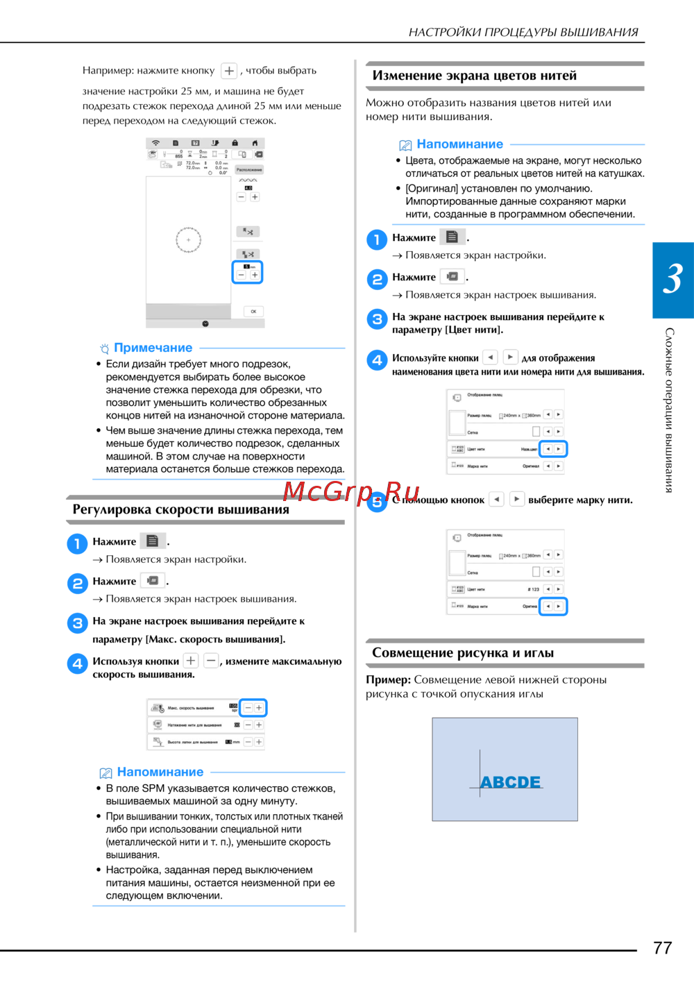- При использовании данных для вышивании отличных от оригинальных рисунков при вышивании слишком плотных стежков или трех и более перекрывающихся стежков может произойти обрыв нити или может быть повреждена игла в этом случае с помощью одной из наших оригинальных систем создания данных отредактируйте данные для вышивания p.119