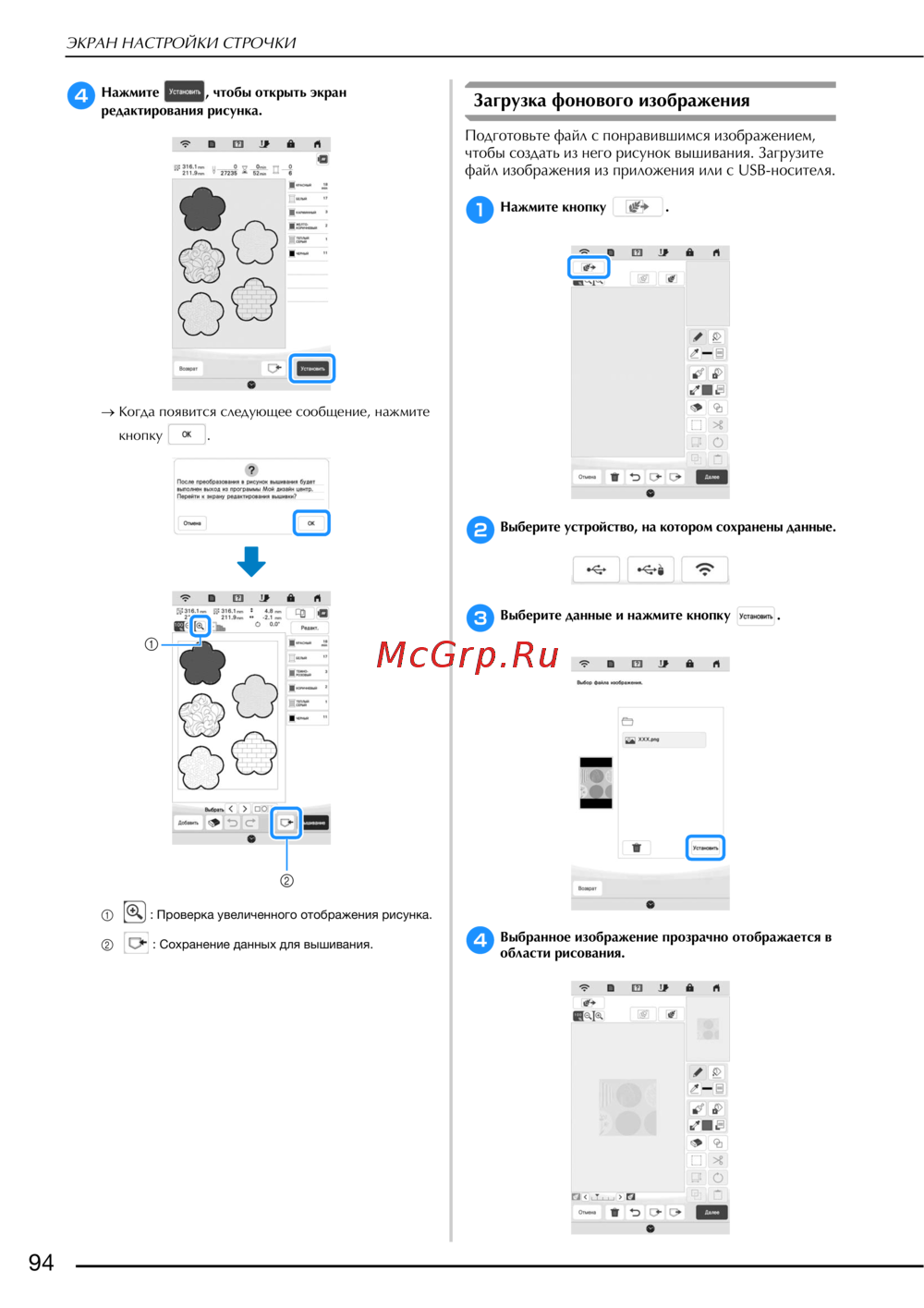 - Подготовьте файл с понравившимся изображением чтобы создать из него рисунок вышивания загрузите файл изображения из приложения или с usb носителя p.96