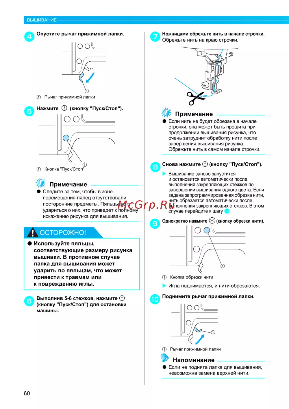 - Перед началом вышивания медленно проверните маховик на себя против часовой стрелки чтобы убедиться что игла не касается лапки для вышивания в противном случае игла может погнуться или сломаться p.83