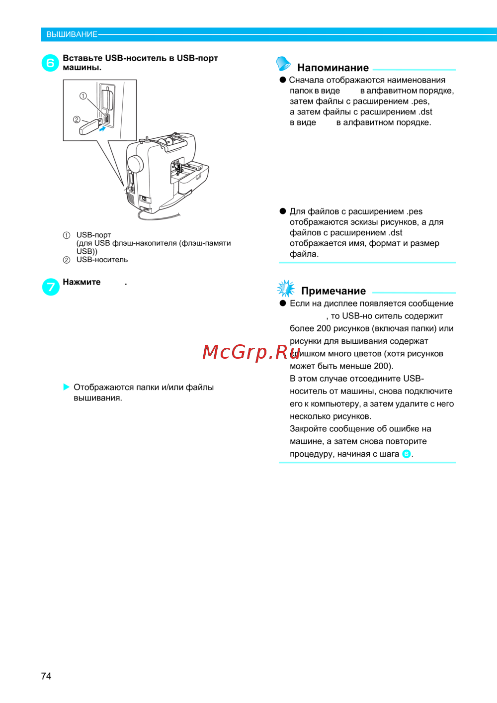 - Передача рисунков для вышивания с компьютера на машину p.75