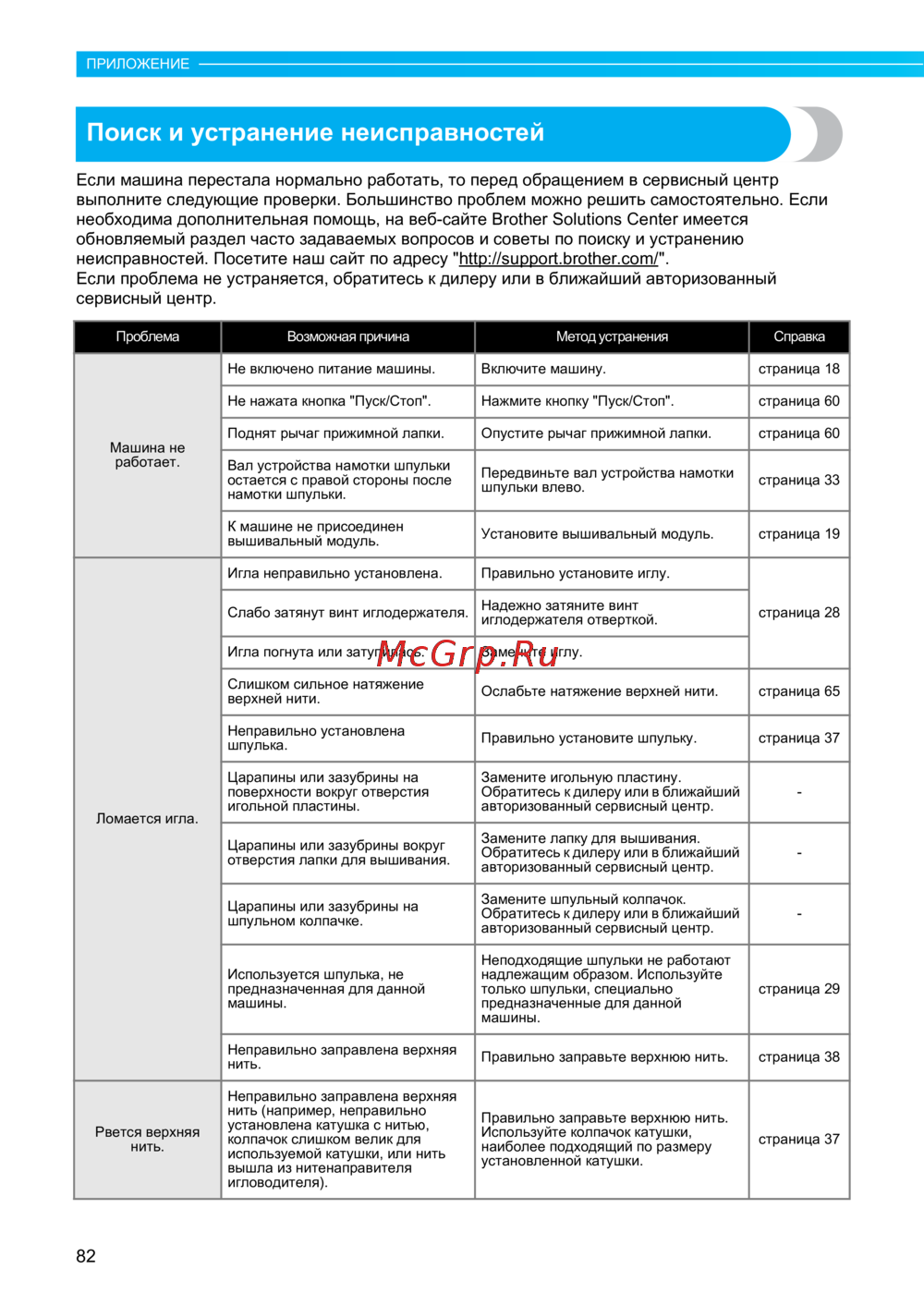 - Если машина перестала нормально работать то перед обращением в сервисный центр выполните следующие проверки большинство проблем можно решить самостоятельно если необходима дополнительная помощь на веб сайте brother solutions center имеется обновляемый раздел часто задаваемых вопросов и советы по поиску и устранению неисправностей посетите наш сайт по адресу http support brother com если проблема не устраняется обратитесь к дилеру или в ближайший авторизованный сервисный центр p.84