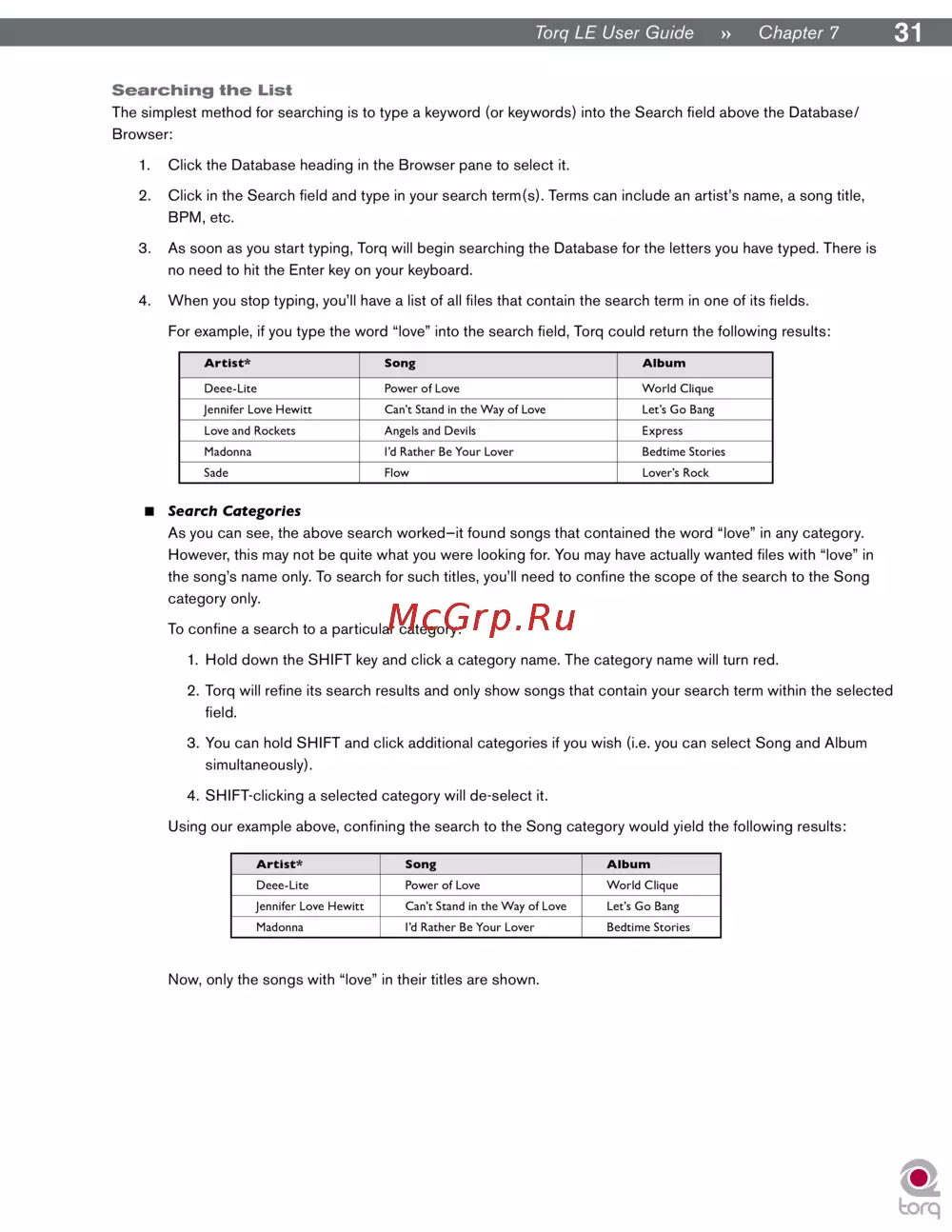 2. Torq will refine its search results and only show songs that contain your search term within the selected