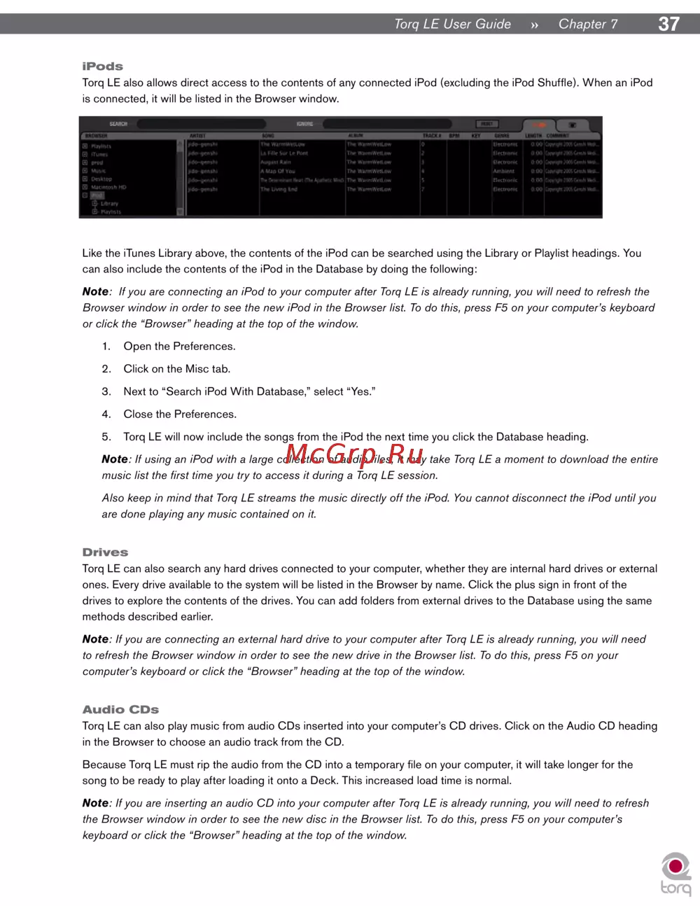 Note: If using an iPod with a large collection of audio fi les, it may take Torq LE a moment to download the entire