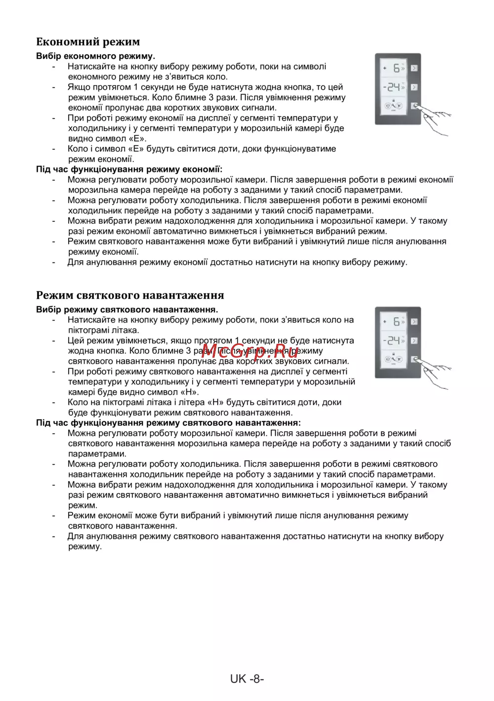 - Після вмикання вилки шнура живлення у розетку на дисплеї на 2 секунди з являться всі символи потім початкові значення настройки морозильної камери 18 с і холодильника 4 с p.9