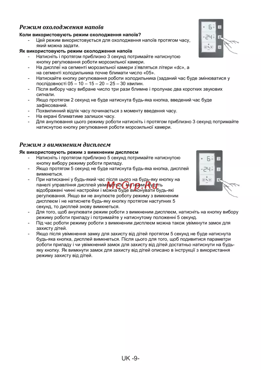 - Після вмикання вилки шнура живлення у розетку на дисплеї на 2 секунди з являться всі символи потім початкові значення настройки морозильної камери 18 с і холодильника 4 с p.9