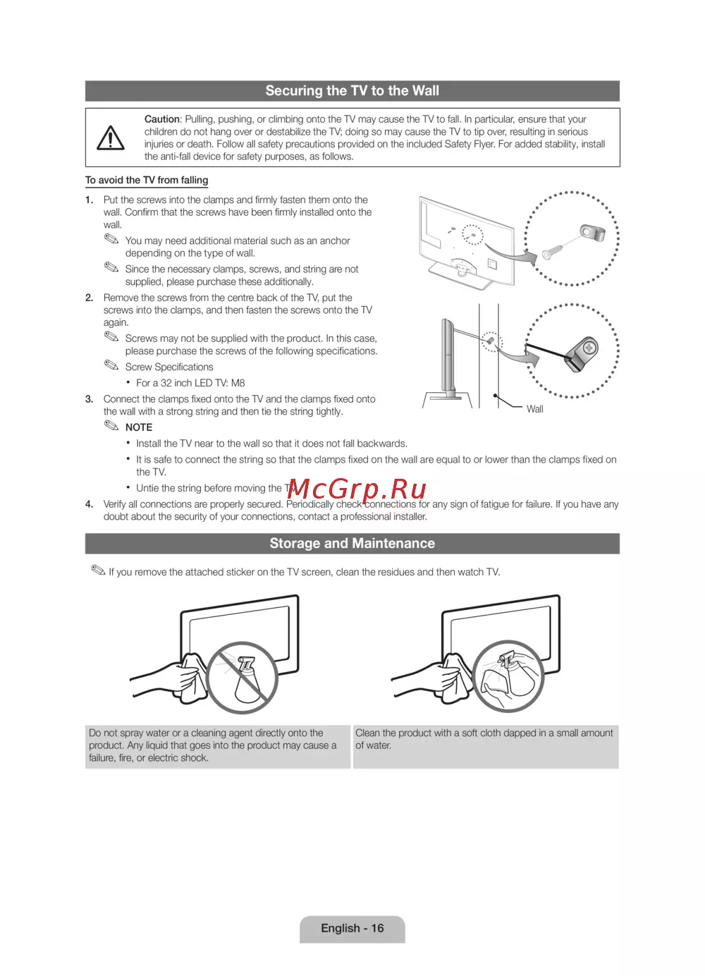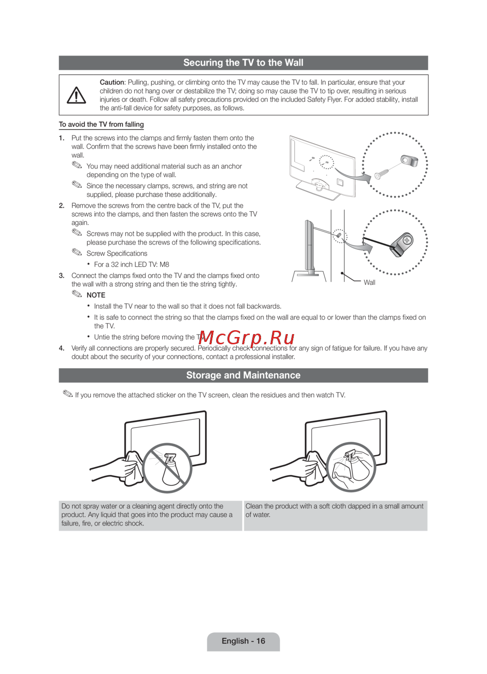 Caution: Pulling, pushing, or climbing onto the TV may cause the TV to fall. In particular, ensure that your