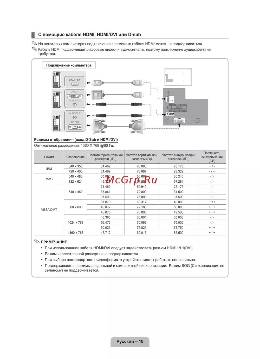 Режимы отображения (вход D-Sub и HDMI/DVI)