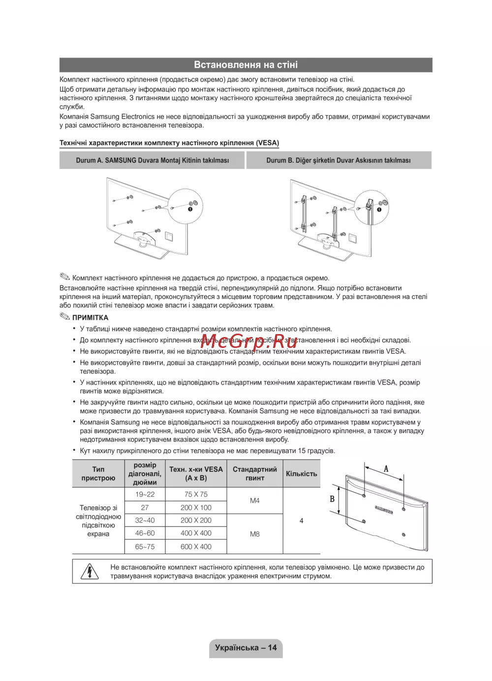 настінного кріплення. З питаннями щодо монтажу настінного кронштейна звертайтеся до спеціаліста технічної