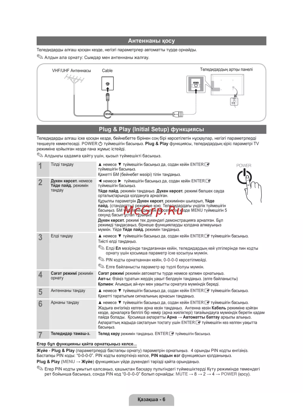 рет бойынша басыңыз, сонда PIN код “0-0-0-0” болып орнайды: MUTE → 8 → 2 → 4 → POWER (қосу).