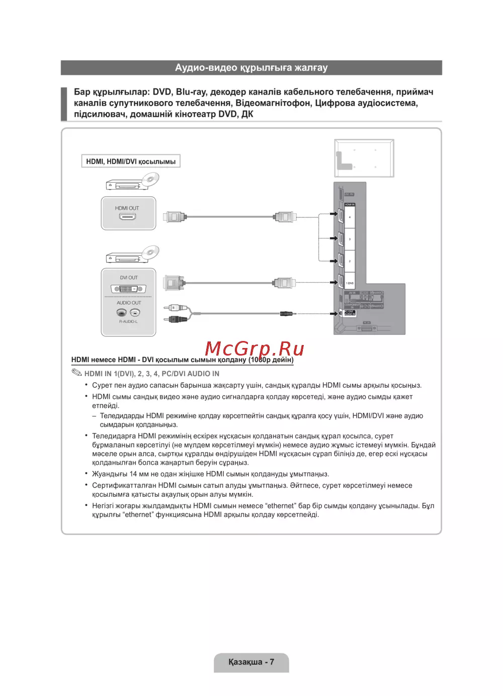 – Теледидарды HDMI режиміне қолдау көрсетпейтін сандық құралға қосу үшін, HDMI/DVI және аудио