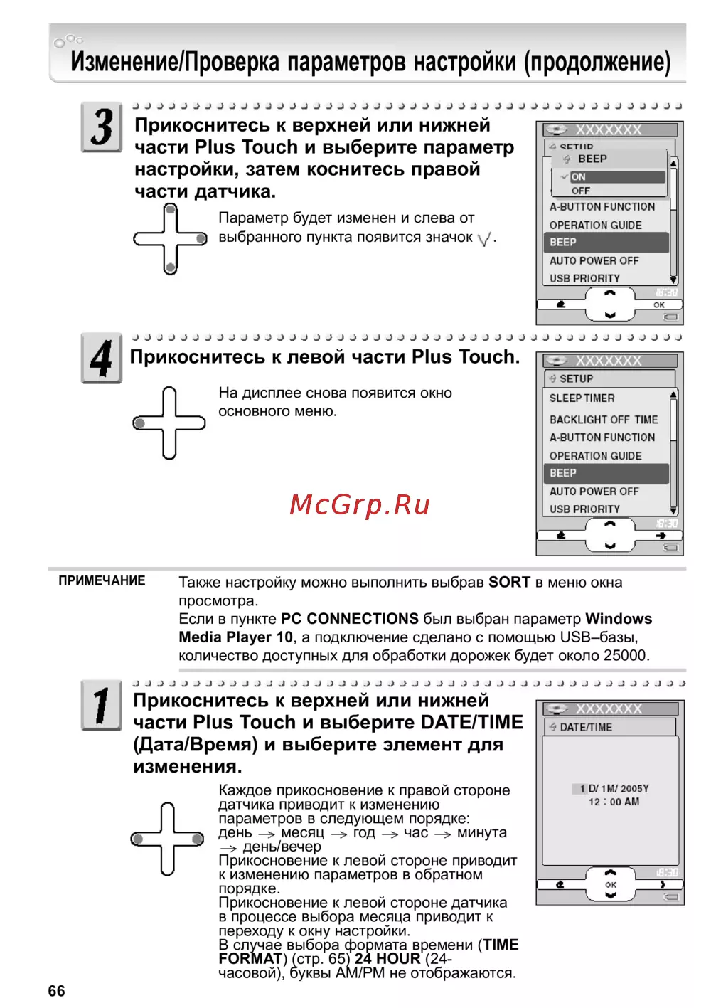 Изменение Проверка параметров настройки продолжение Прикоснитесь к верхней или нижней части Plus Touch и выберите параметр настройки затем коснитесь правой части датчика Параметр будет изменен и слева от выбранного пункта появится значок Прикоснитесь к левой части Plus Touch На дисплее снова основного меню ПРИМЕЧАНИЕ появится окно Также настройку можно выполнить выбрав SORT в меню окна просмотра Если в пункте PC CONNECTIONS был выбран параметр Windows Media Player 10 а подключение сделано с помощью USB базы количество доступных для обработки дорожек будет около 25000 Прикоснитесь к верхней или нижней части Plus Touch и выберите DATEH IME Дата Время и выберите элемент для изменения Каждое прикосновение к правой стороне датчика приводит к изменению параметров в следующем порядке день месяц год час минута день вечер Прикосновение к левой стороне приводит к изменению параметров в обратном порядке Прикосновение к левой стороне датчика в процессе выбора месяца приводит к переходу к окну настройки В случае выбора формата времени TIME FORMAT стр 65 24 HOUR 24часовой буквы АМ РМ не отображаются 66