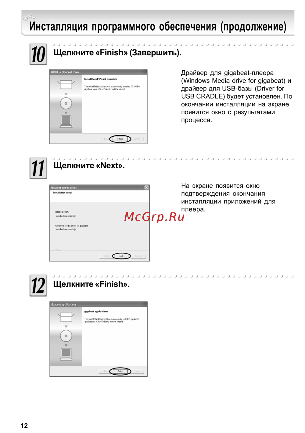 Инсталляция программного обеспечения продолжение 10 Щелкните Finish Завершить Драйвер для gigabeat nneepa Windows Media drive for gigabeat и драйвер для USB базы Driver for USB CRADLE будет установлен По окончании инсталляции на экране появится окно с результатами процесса Щелкните Next На экране появится окно подтверждения окончания инсталляции приложений для плеера 12 12 Щелкните Finish