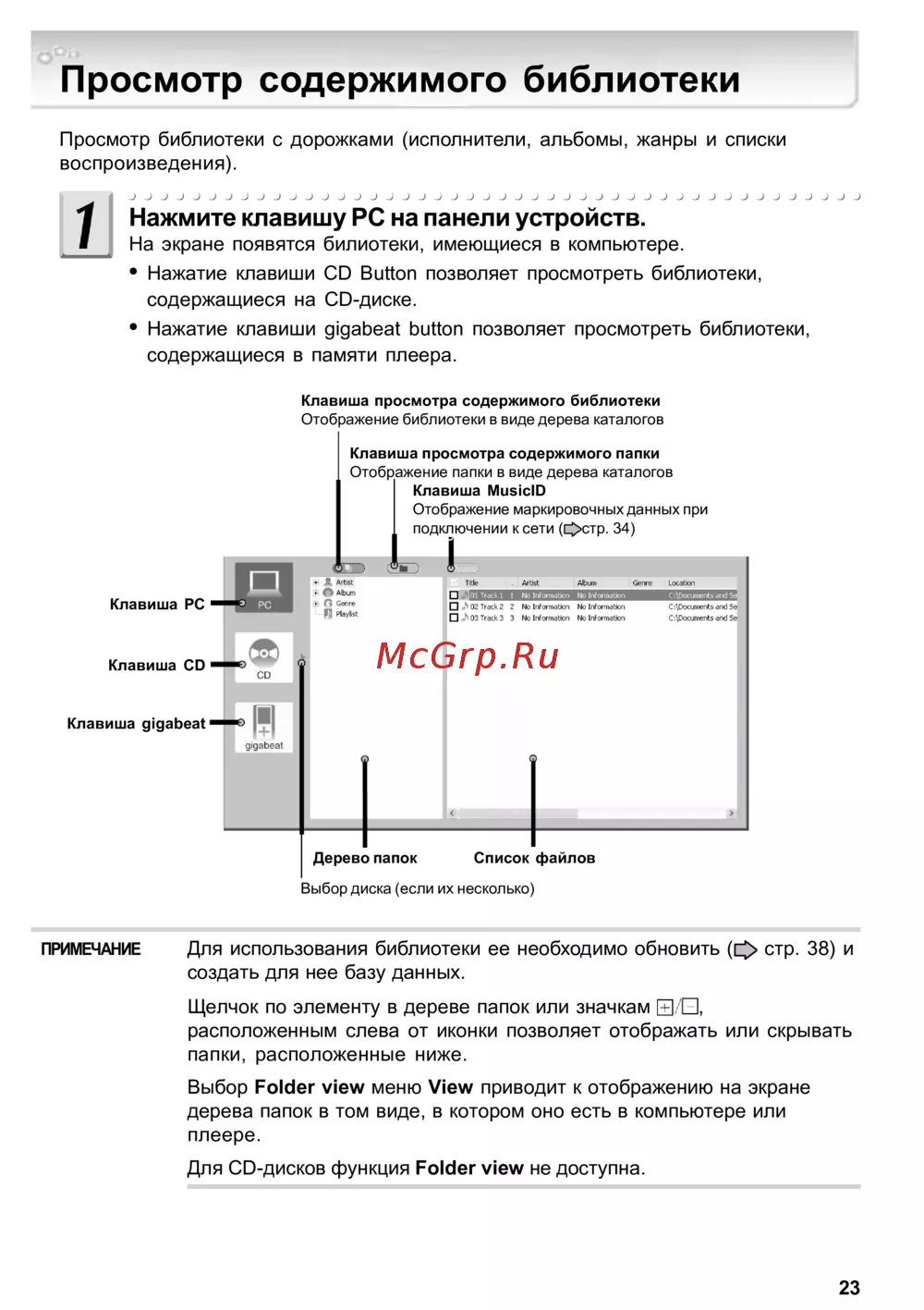 Просмотр содержимого библиотеки Просмотр библиотеки с дорожками исполнители альбомы жанры и списки воспроизведения Нажмите клавишу РС на панели устройств На экране появятся билиотеки имеющиеся в компьютере Нажатие клавиши CD Button позволяет просмотреть библиотеки содержащиеся на CD диске Нажатие клавиши gigabeat button позволяет просмотреть библиотеки содержащиеся в памяти плеера Клавиша просмотра содержимого библиотеки Отображение библиотеки в виде дерева каталогов Клавиша просмотра содержимого папки Отображение папки в виде дерева каталогов I Клавиша Миз с10 Отображение маркировочных данных при I подключении к сети Остр 34 Клавиша РС J лпи _ с irrcniwcn гатшот bniteihS S Ao Irfwnrfvn ttoH rim ai cti ccunsnts rc лкSi Клавиша СО Клавиша gigabeat gigaDeal Дерево папок Список файлов Выбор диска если их несколько ПРИМЕЧАНИЕ Для использования библиотеки ее необходимо обновить с стр 38 и создать для нее базу данных Щелчок по элементу в дереве папок или значкам расположенным слева от иконки позволяет отображать или скрывать папки расположенные ниже Выбор Folder view меню View приводит к отображению на экране дерева папок в том виде в котором оно есть в компьютере или плеере Для CD дисков функция Folder view не доступна 23