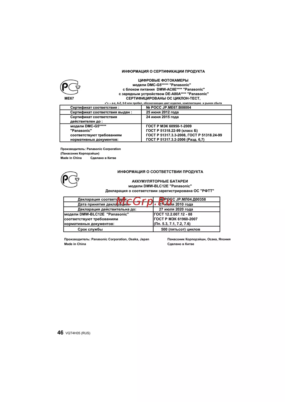 модели DMW-BLC12E "Panasonic" ГОСТ 12.2.007.12 - 88