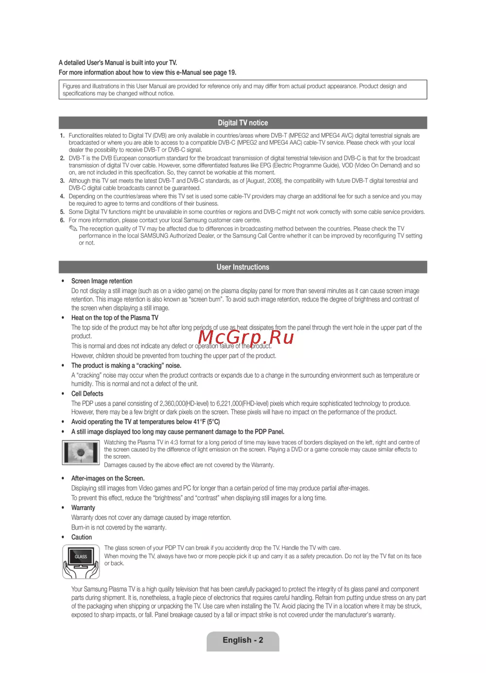 Your Samsung Plasma TV is a high quality television that has been carefully packaged to protect the integrity of its glass panel and component