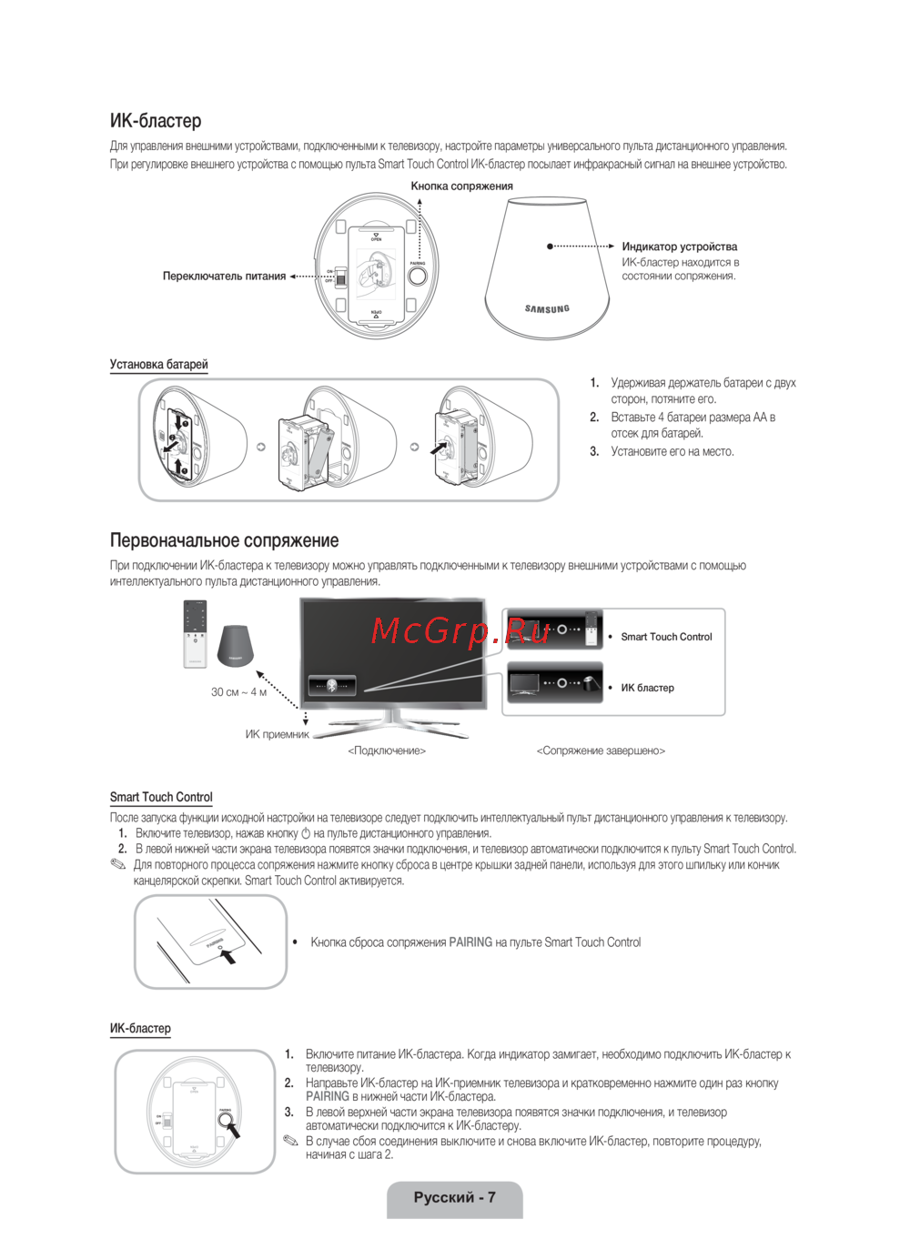 При регулировке внешнего устройства с помощью пульта Smart Touch Control ИК-бластер посылает инфракрасный сигнал на внешнее устройство.