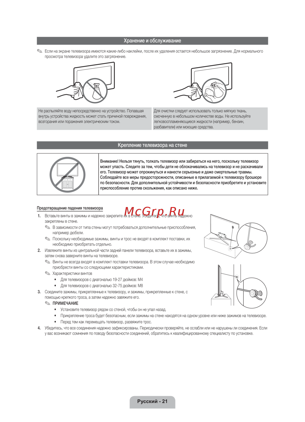 Внимание! Нельзя тянуть, толкать телевизор или забираться на него, поскольку телевизор