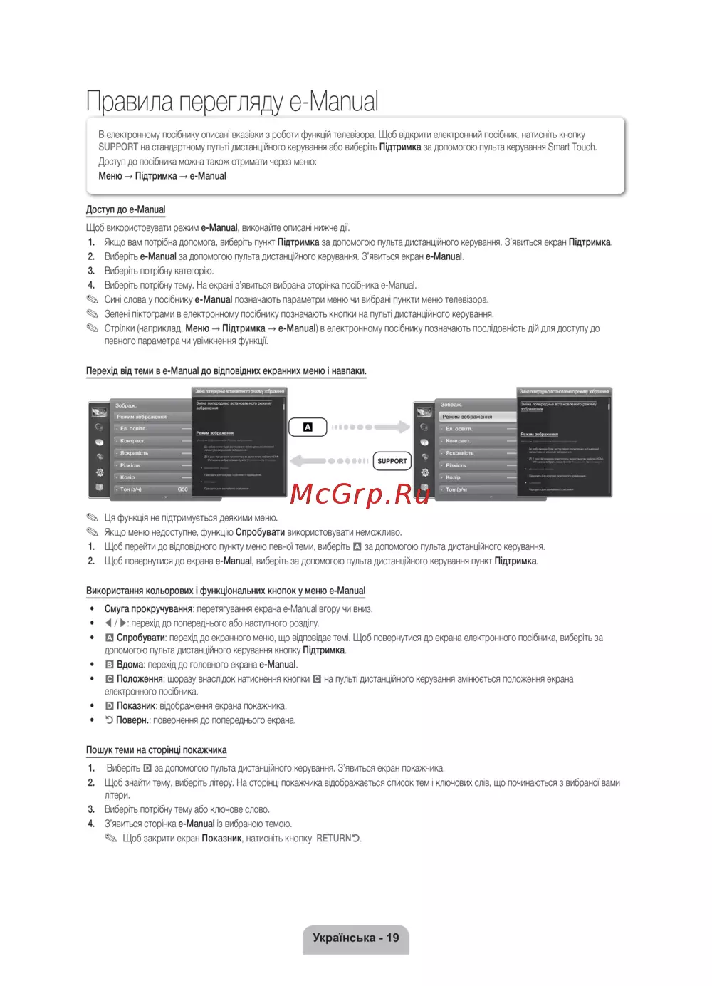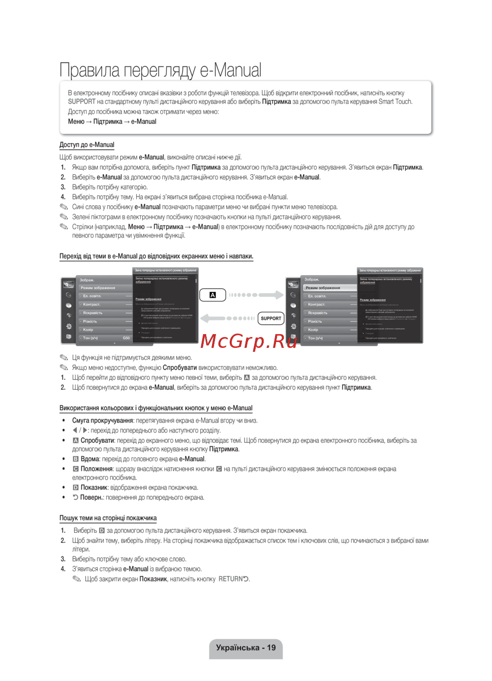 Стрілки (наприклад, Меню → Підтримка → e-Manual) в електронному посібнику позначають послідовність дій для доступу до