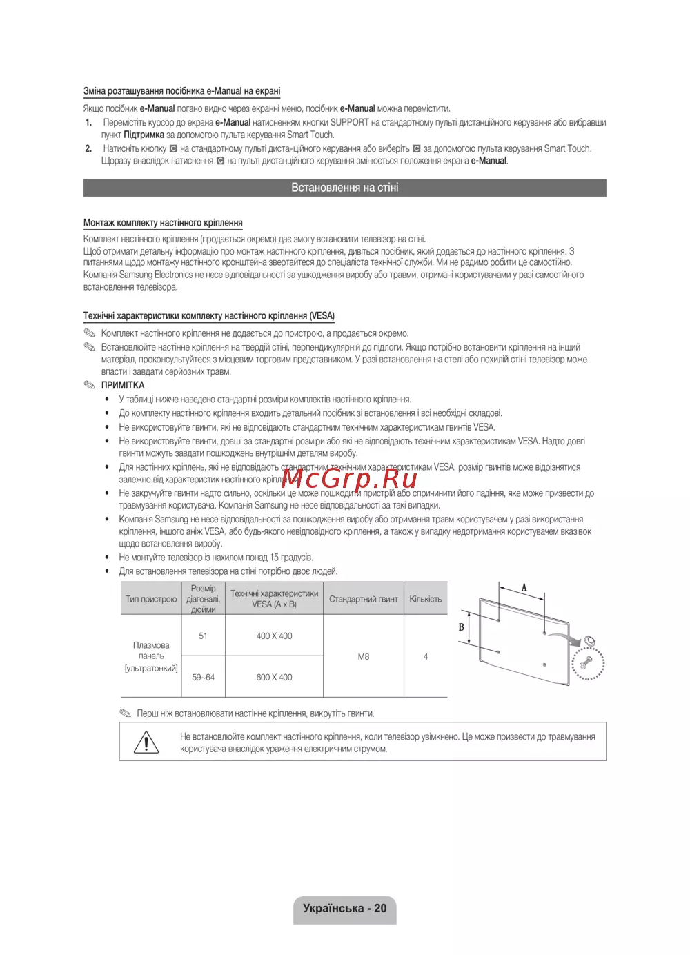 кріплення, іншого аніж VESA, або будь-якого невідповідного кріплення, а також у випадку недотримання користувачем вказівок