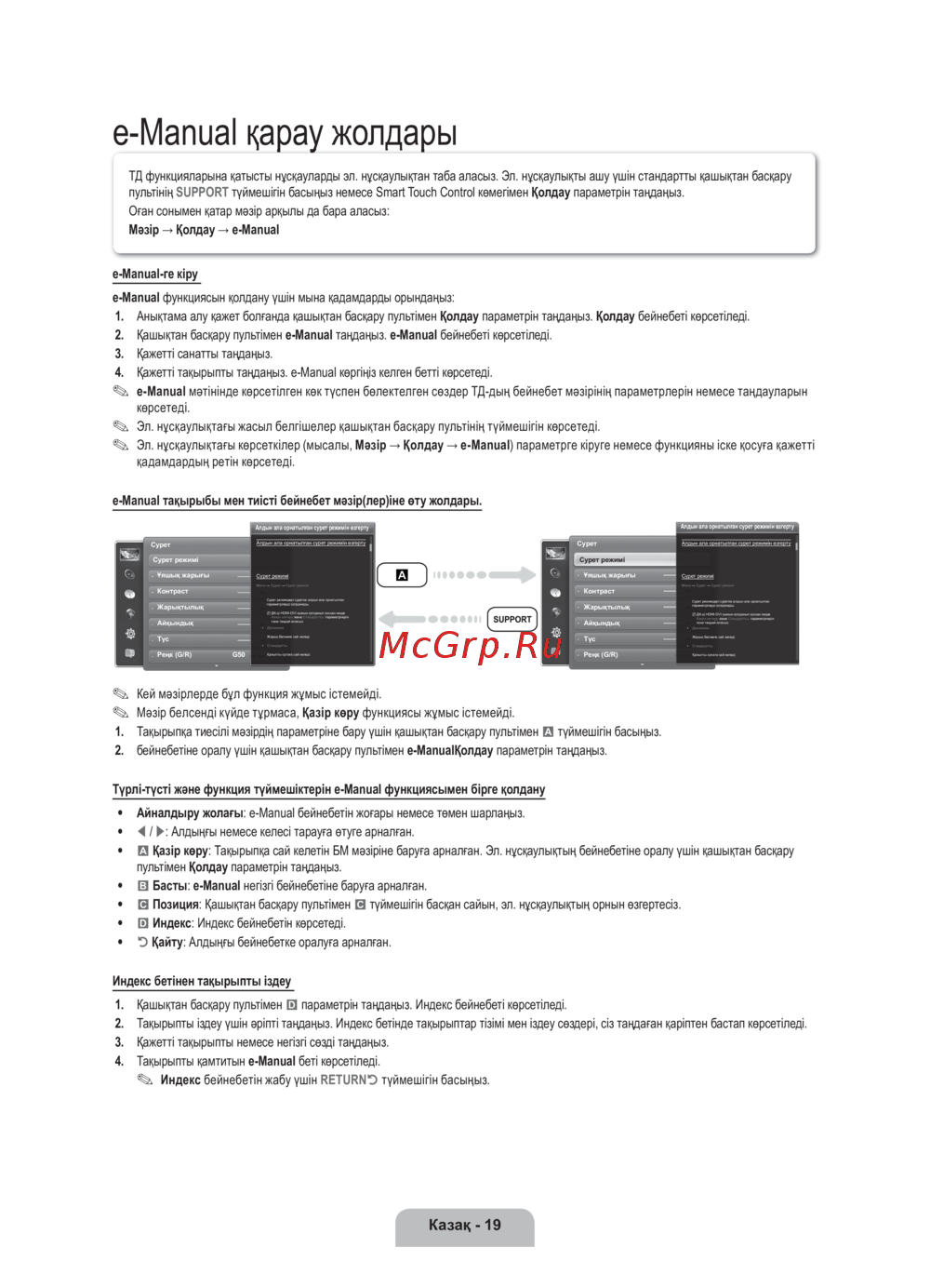 Эл. нұсқаулықтағы көрсеткілер (мысалы, Мәзір → Қолдау → e-Manual) параметрге кіруге немесе функцияны іске қосуға қажетті