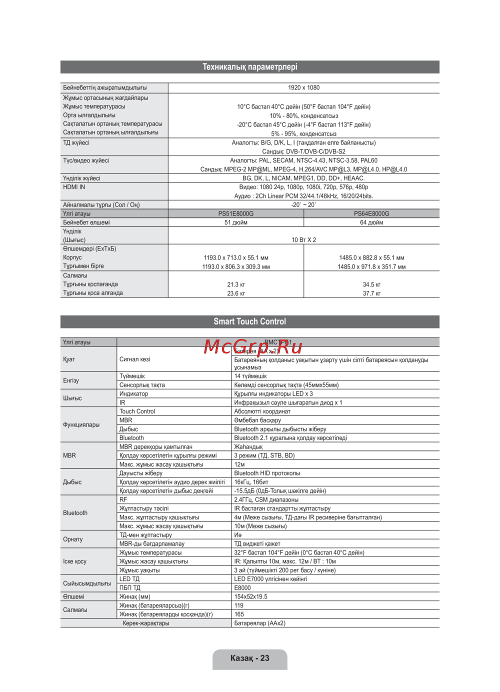 Samsung PS64E8000GS [92/93] Техникалық параметрлері
