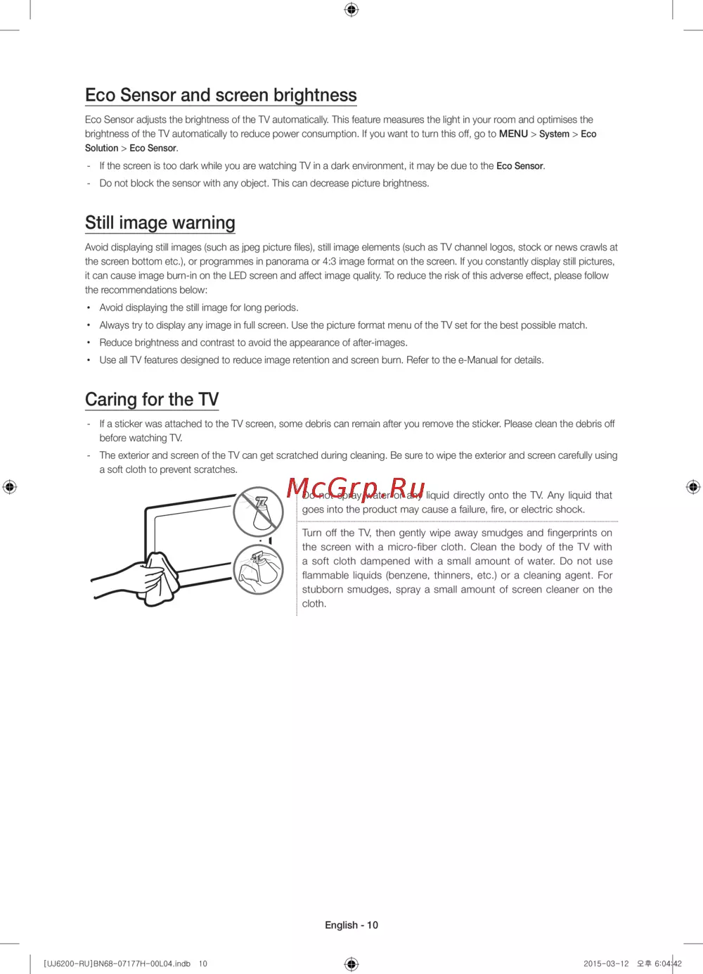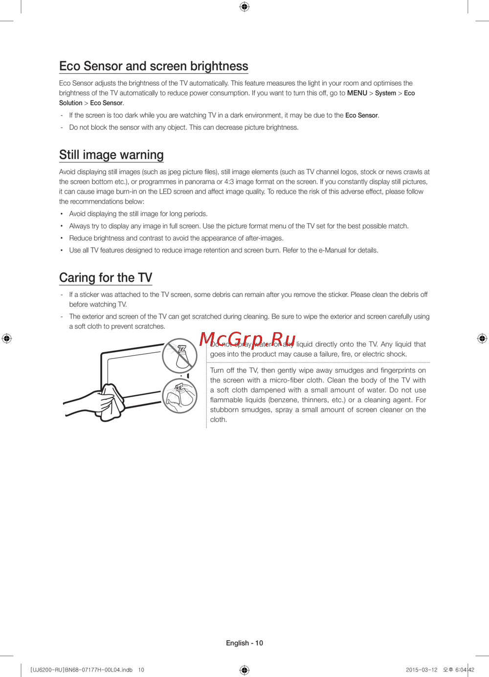 ![Samsung UE55J6300A [28/68] Turn off the tv then gently wipe away smudges and fingerprints on the screen with a micro fiber cloth clean the body of the tv with a soft cloth dampened with a small amount of water do not use flammable liquids benzene thinners etc or a cleaning agent for stubborn smudges spray a small amount of screen cleaner on the cloth](/views2/1132472/page28/bg1c.png)
