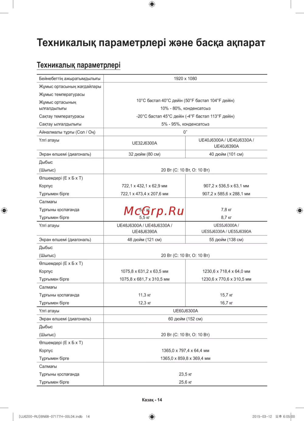 Samsung UE55J6300A [64/68] Техникалық параметрлері және басқа ақпарат