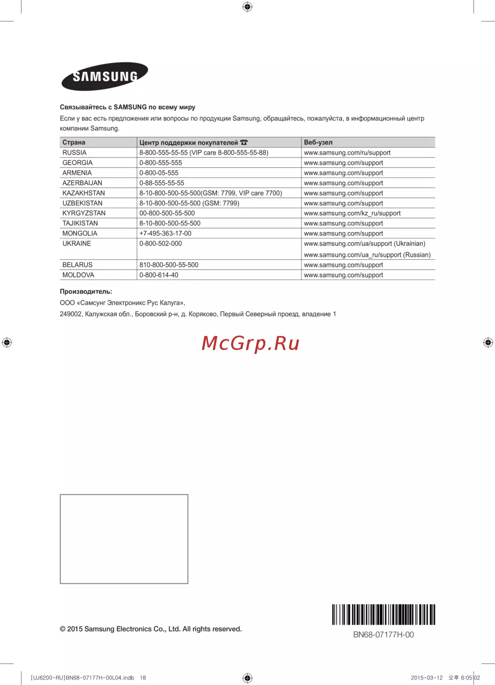 RUSSIA 8-800-555-55-55 (VIP care 8-800-555-55-88) www.samsung.com/ru/support