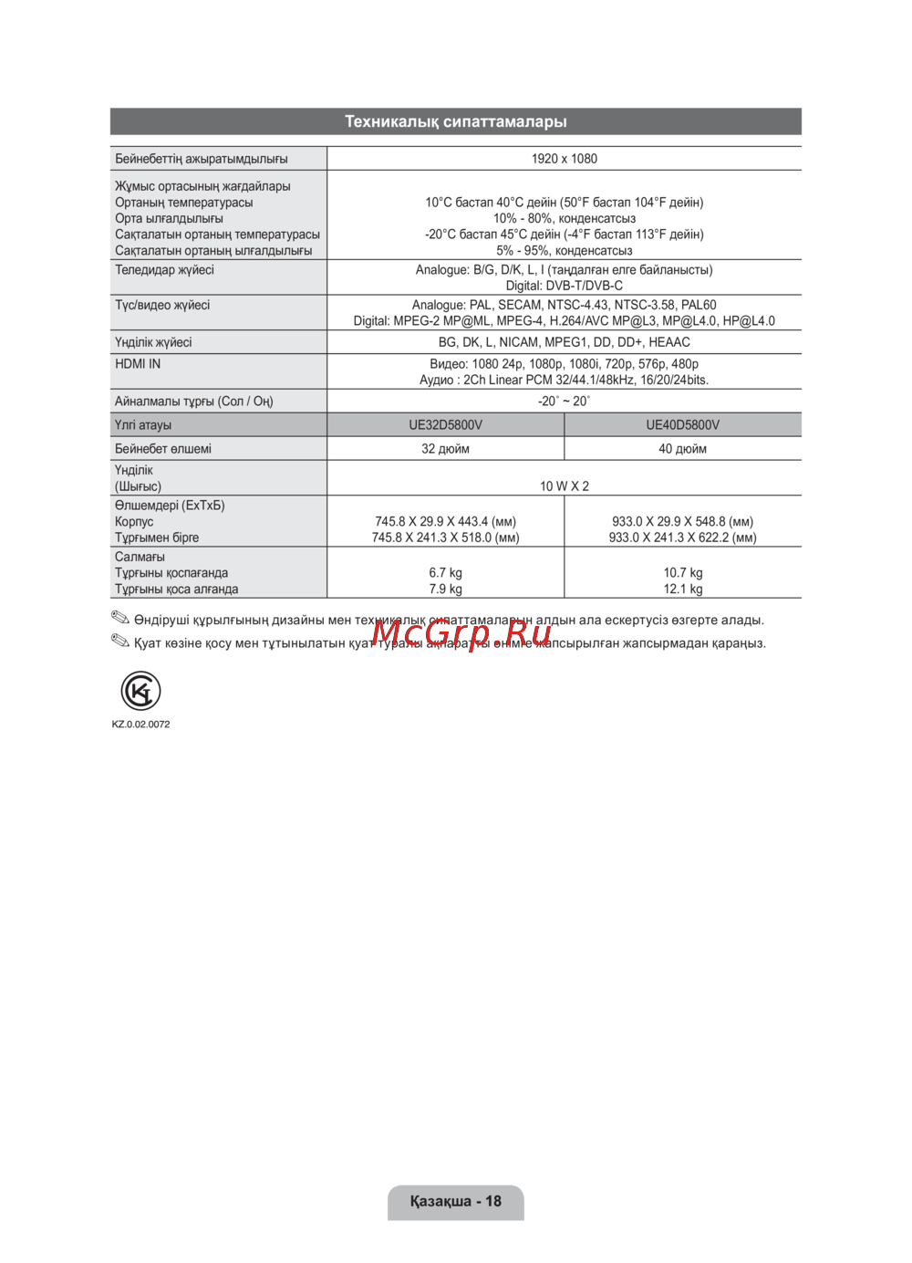 - Теледидар пішіміне қатысты кепілдік туралы маңызды ақпарат p.56