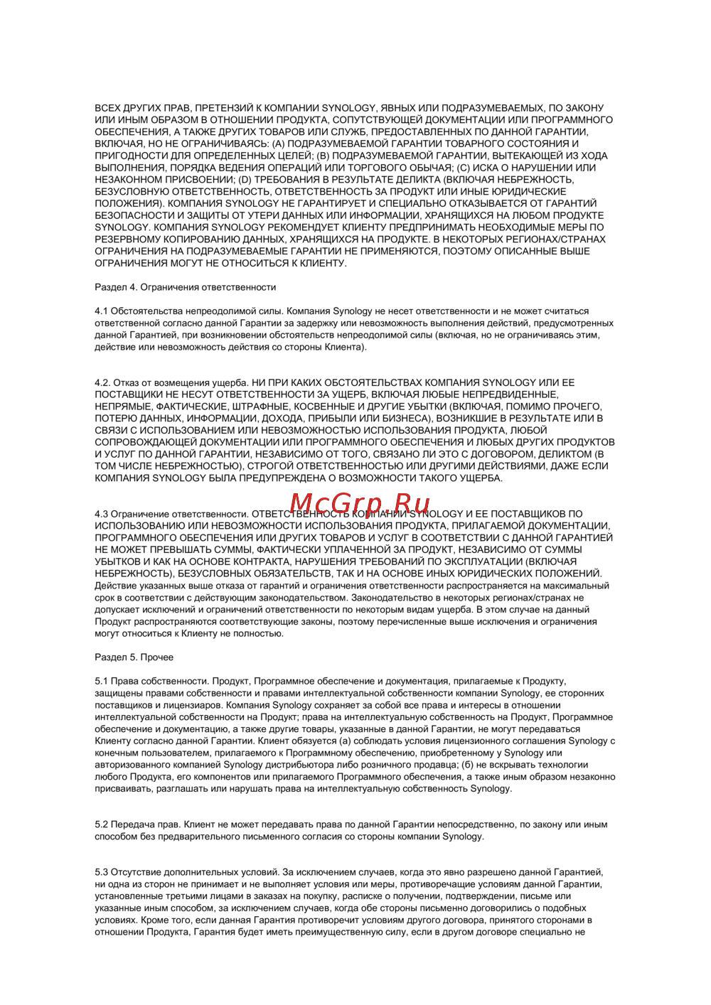 4.1 Обстоятельства непреодолимой силы. Компания Synology не несет ответственности и не может считаться