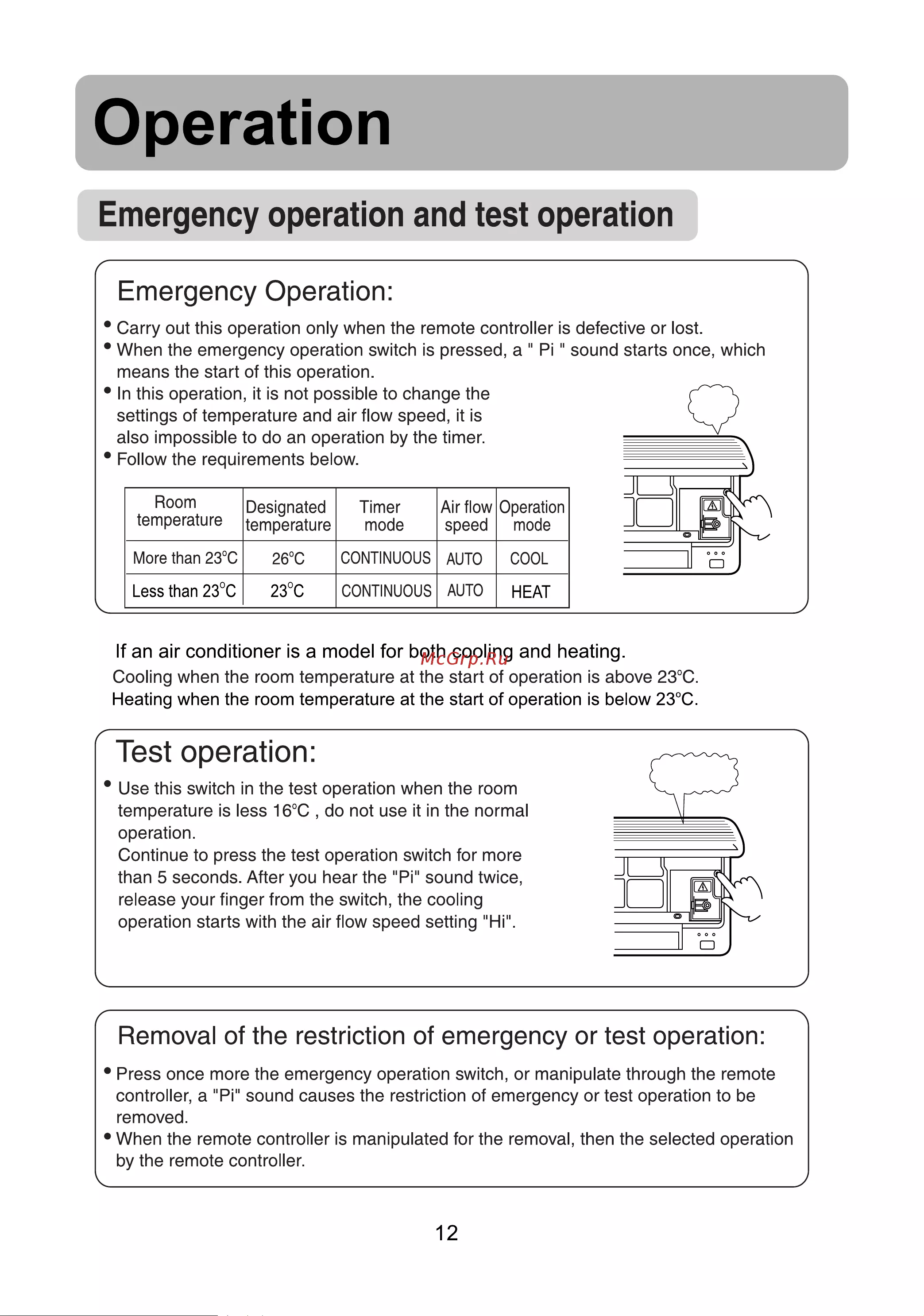 Operation Emergency operation and test operation Emergency Operation Carry out this operation only when the remote controller is defective or lost When the emergency operation switch is pressed a Pi sound starts once which means the start of this operation In this operation it is not possible to change the settings of temperature and air flow speed it is also impossible to do an operation by the timer Follow the requirements below Room temperature Designated temperature Timer mode Air flow Operation speed mode More than 23 C 26 C CONTINUOUS AUTO COOL Less than 23 C 23 C CONTINUOUS AUTO HEAT If an air conditioner is a model for both cooling and heating Cooling when the room temperature at the start of operation is above 23 C Heating when the room temperature at the start of operation is below 23 C Test operation Use this switch in the test operation when the room temperature is less 16 C do not use it in the normal operation Continue to press the test operation switch for more than 5 seconds After you hear the Pi sound twice release your finger from the switch the cooling operation starts with the air flow speed setting Hi Removal of the restriction of emergency or test operation Press once more the emergency operation switch or manipulate through the remote controller a Pi sound causes the restriction of emergency or test operation to be removed When the remote controller is manipulated for the removal then the selected operation by the remote controller 12