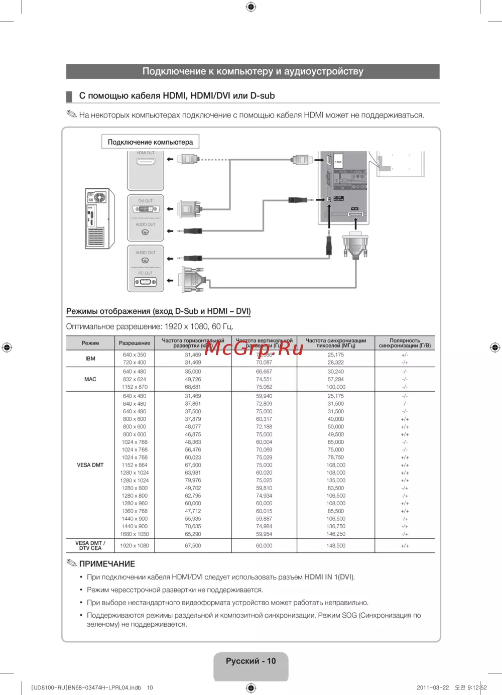 ¦ С помощью кабеля HDMI, HDMI/DVI или D-sub