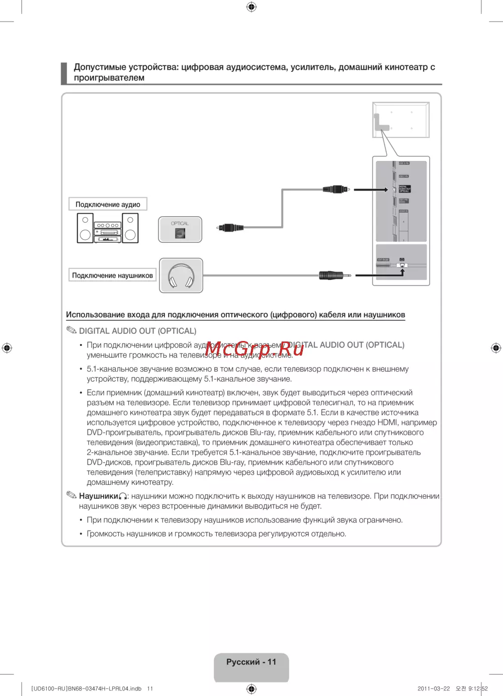 Использование входа для подключения оптического (цифрового) кабеля или наушников