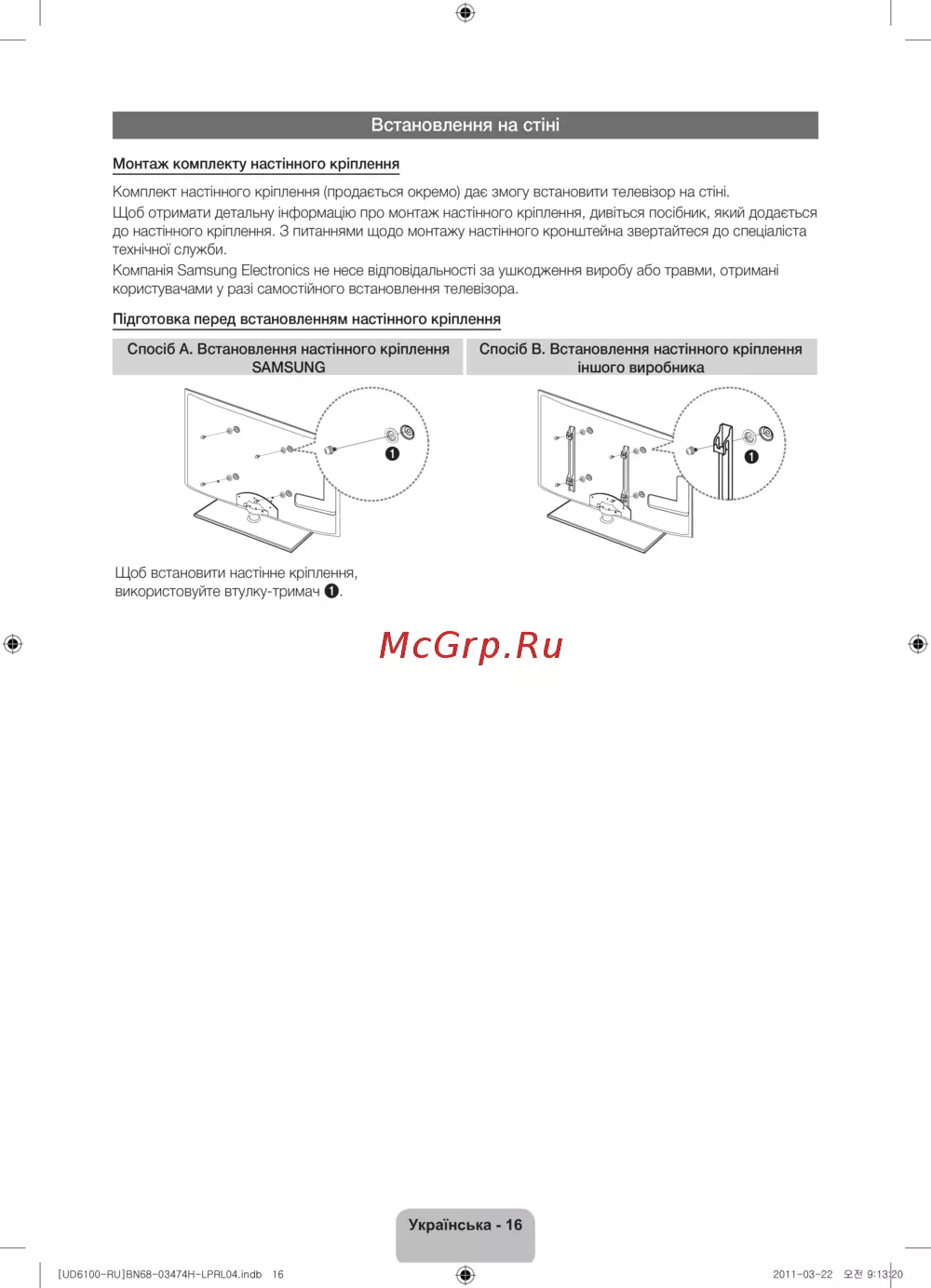 до настінного кріплення. З питаннями щодо монтажу настінного кронштейна звертайтеся до спеціаліста