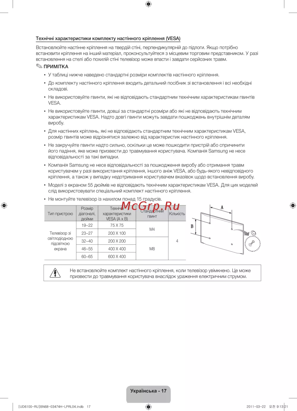 Samsung UE32D6100SW — технічні характеристики настінного кріплення для телевізора [59/84]