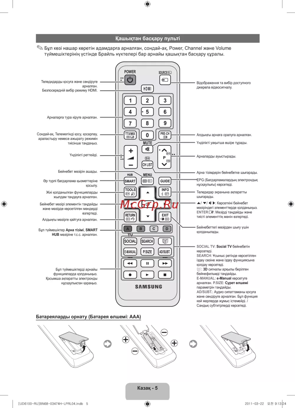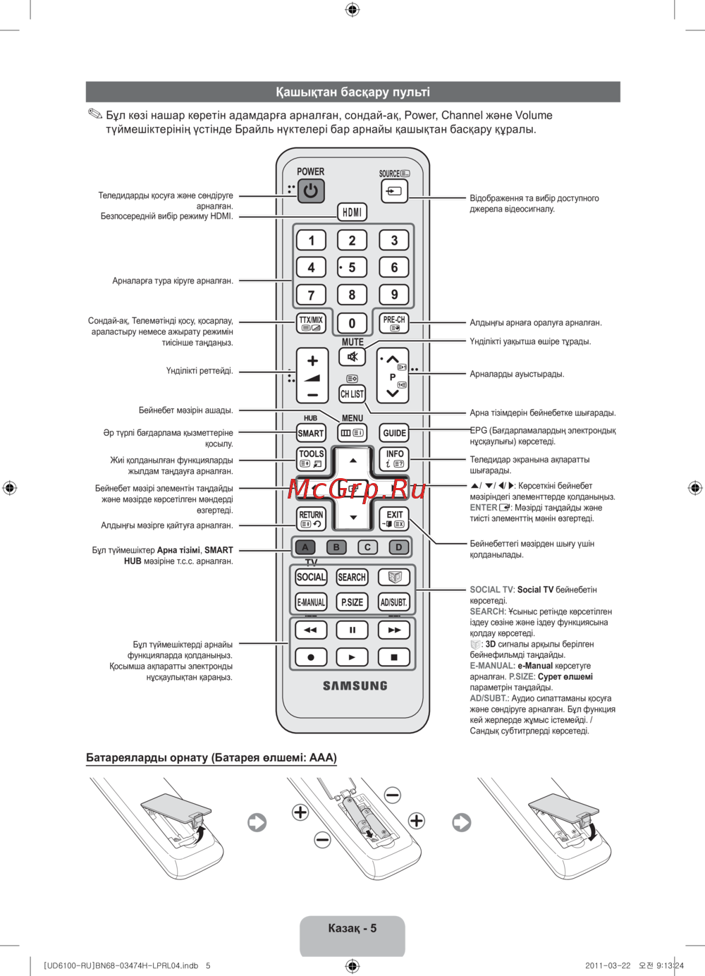 - Бұл көзі нашар көретін адамдарға арналған сондай ақ power channel және volume түймешіктерінің үстінде брайль нүктелері бар арнайы қашықтан басқару құралы p.67