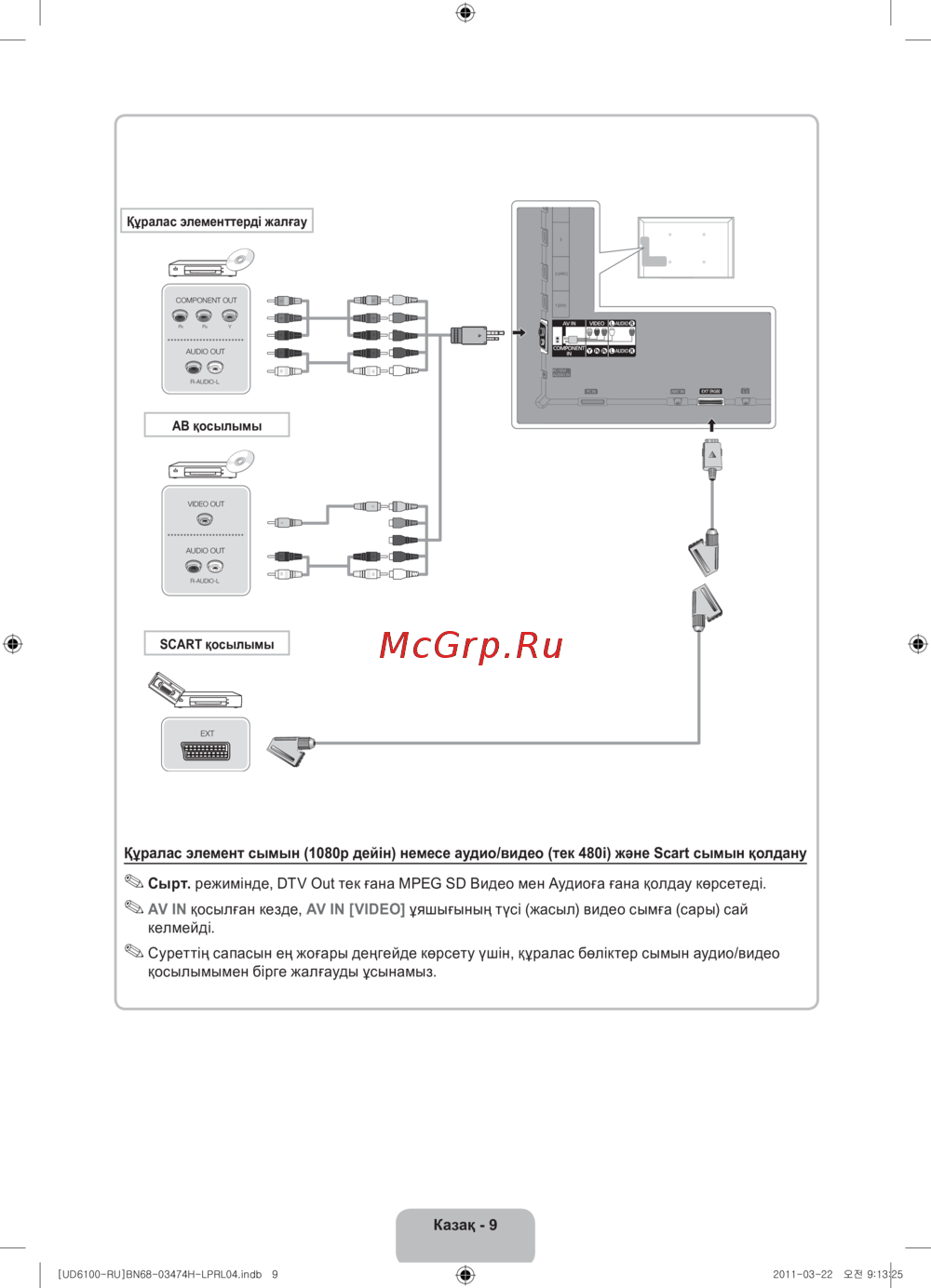 - Құралас элемент сымын 1080p дейін немесе аудио видео тек 480i және scart сымын қолдану p.71