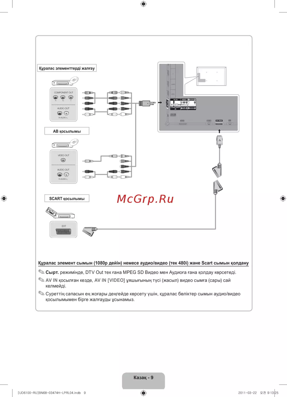 - Суреттің сапасын ең жоғары деңгейде көрсету үшін құралас бөліктер сымын аудио видео қосылымымен бірге жалғауды ұсынамыз p.71