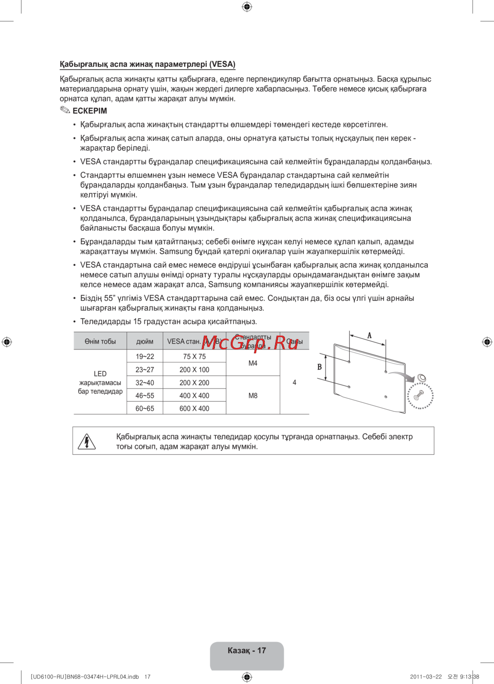 Samsung UE32D6100SW — қабырғалық аспа жинақ параметрлері мен орнату нұсқаулары [79/84]